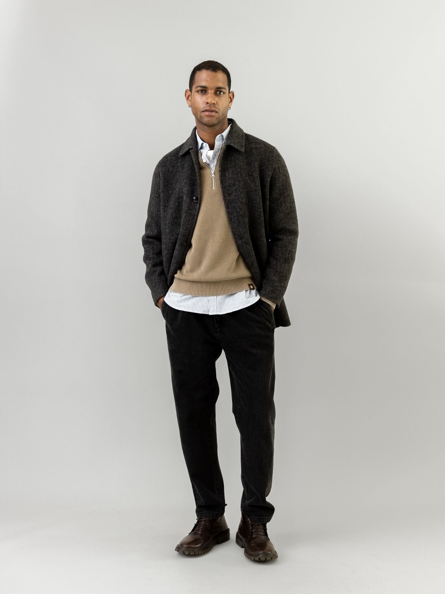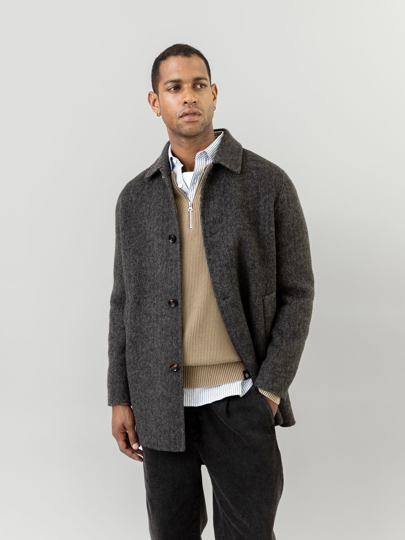 Tailored from herringbone wool, this coat offers a refined silhouette with a light, floating feel. It’s designed in a regular fit with button closure and functional pockets—ideal for layering without the weight. A timeless outer layer that channels understated sophistication with ease.